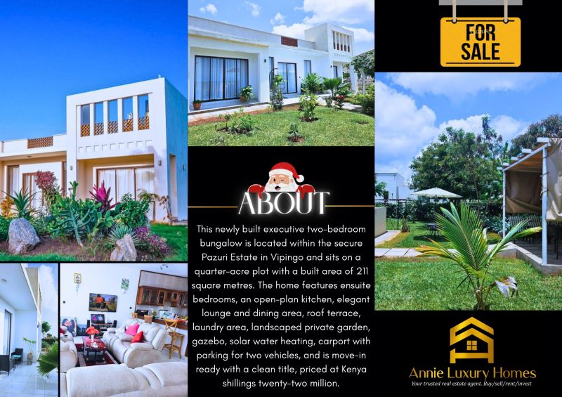 2-BEDROOM BUNGALOW FOR SALE – Vipingo, Kilifi County • Newly built detached 2-bedroom bungalow • Located in the secure and serene Pazuri Estate, Vipingo • Land size: Quarter acre • Built area: 211 sqm • Price: KES 22,000,000 Features: • Two spacious ensuite bedrooms • Three bathrooms • Open-plan kitchen, dining, and lounge • Roof terrace with outdoor potential • Dedicated laundry area • Large private landscaped garden • Carport and parking for two vehicles Extras: • Solar water heating system • Gazebo • Fitted kitchen cabinets and wardrobes • Tiled floors throughout • Prepaid electricity meter • 24-hour power supply • Wi-Fi ready • Clean title • Move-in ready (furniture and curtains only needed) Contact Annie Luxury Homes +254 743 260 826 +254 791 483 787