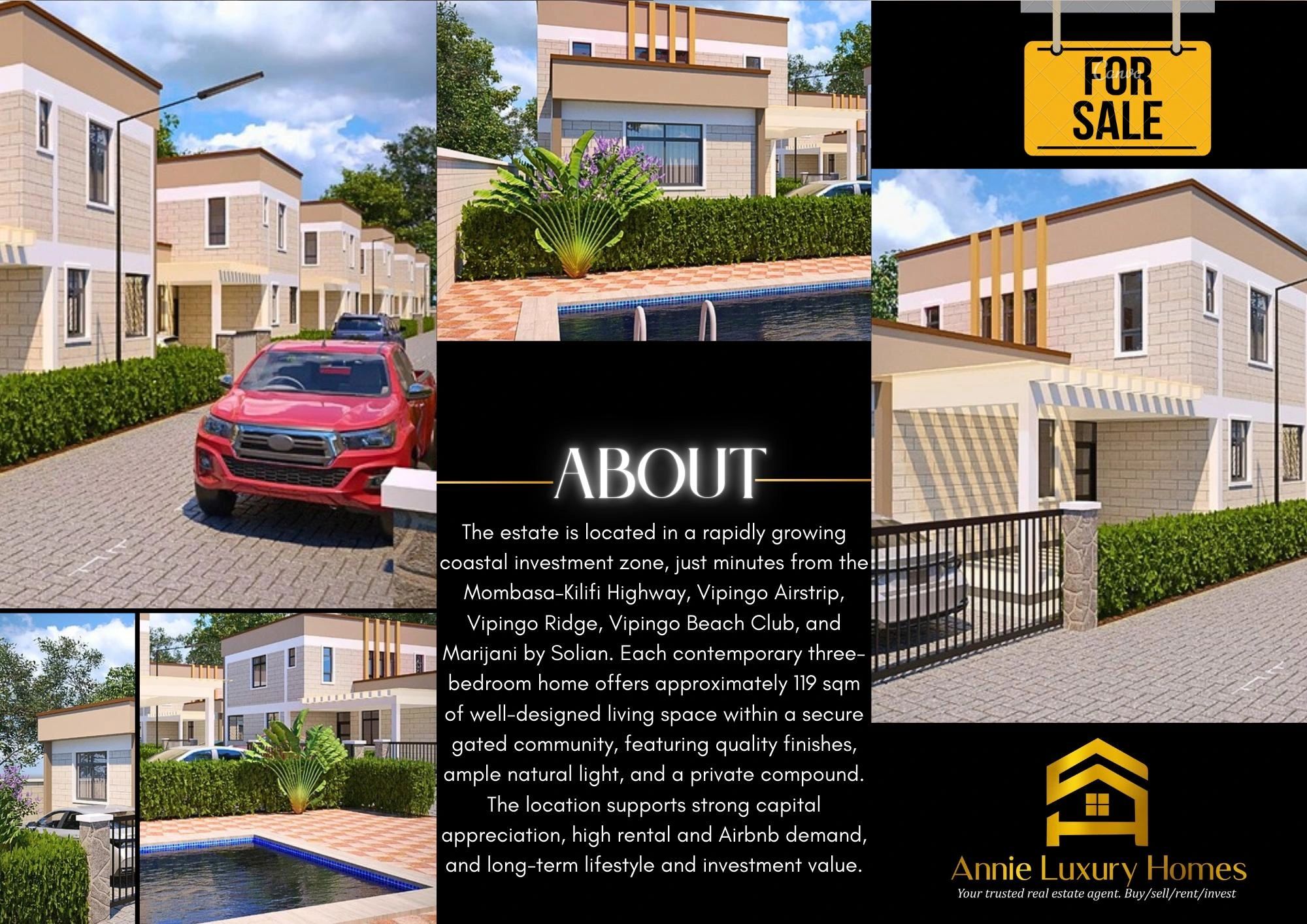 Vipingo Pearl Estate – Secure. Stylish. Smart Living.🏡 Discover a beautiful gated community in Vipingo featuring modern 3-bedroom maisonettes, each thoughtfully designed with 2 dedicated parking spaces. Residents enjoy access to a swimming pool, a secure environment, and a peaceful coastal lifestyle. Perfect for families, homeowners, or investors. 📍 Vipingo, Kilifi 🏊♂️ Gated estate with swimming pool 🚗 2 parking spaces per unit 💼 Ideal for living or investment 📞 Book a viewing today with Annie Luxury Homes and secure your place in this prime community. Contact us 0743260826 | 0791483787 Annie Luxury Homes.